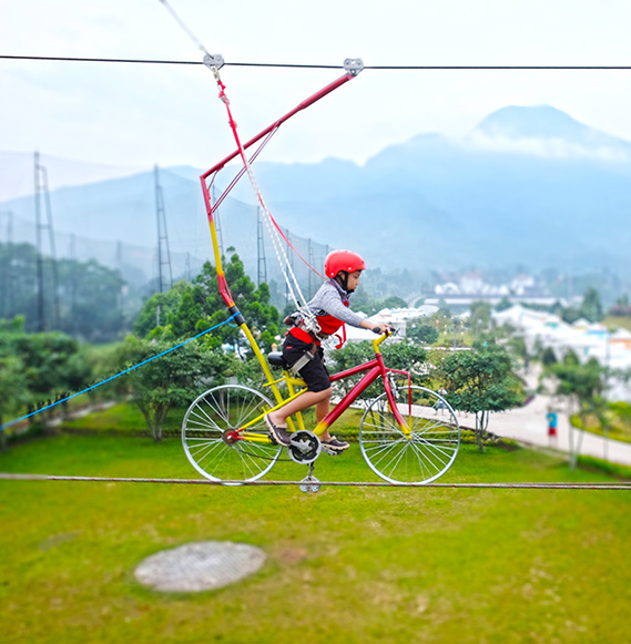 Anda akan diajak naik sepeda di atas sebuah tali pada ketinggian tertentu. Namun, Anda tak perlu kuatir akan terjatuh karena ada tali pengaman. Saat melintasi tali, Anda akan merasakan sensasi naik sepeda melayang di udara. Asyik banget, deh!